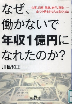 肝心の、「「会社を辞めて収入ゼロから年収1億円」なったことの説明がこの本では抜けています。何で年収1億円になったことが書かれていません。そこでこの本に貼り付けられている川島のメールマガジンとブログにジャンプしてみました。そこには「パソコン1台で最新の稼ぎ」ができると出ています。具体的には、アフィリエイト、オークション、メルマガ増加ノウハウ等々。私が思うにはメルマガやファイスブック、ツイッターなどで読者を多く獲得して、そこに会社の宣伝を貼り付け、広告費を貰い受けるということではないでしょうか。だから川島のブログやメルマガ見れば見るほどアクセス数が上がり、川島への会社の宣伝広告費が上がっていくことになり、川島の収入が増えるということになります。IT先進者が後進者を食い物にしているともいえるでしょう。素敵なキャッチフレーズ「働かないで1億円」に引っかかって彼のブログやファイスブックを見るたびに彼の収入は増え、かつまたそこに貼り付けている自分が書いた本の宣伝で、また本も売れ、彼にとっては願ったりかなったりの世界になってしまうということになります。