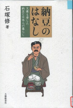 この本の表紙には夏目漱石と思われる漫画が載っています。「門」では「朝になると欠かさず通る納豆売りの声が、瓦を鎖す霜の色を連想せしめた」との文章を書き抜き、納豆売りが江戸時代から冬の風物詩であったと著者は言っています。しかしながら江戸時代末期になると一年中納豆は売られるようになっています。