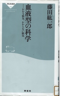私はB型なので、B型に関する記述を注意深く読みました。やはりB型は肺炎になりやすいそうです。結核も同じです。梅毒も重症になりやすい。感染症に弱いB型はあまり人付き合いをしないで、「オタク」になりやすい傾向にあります。私は頷いてしまいます。B型に合う食物は羊肉、鯨、ハマグリ、かめ、ワニだそうです。かめやワニなど食ったことがありませんが、体に良いといわれれば食ってみたい気にもなります。合わないものは豚肉と、なまず、うなぎだそうです。うなぎは今では高くて食えませんが、豚肉が合わないというのは悲しい限りです。私は結構豚肉を食べています。私にはO型も混じっていますから、自分では大丈夫だろうと、このところだけは無視することにしましょう。