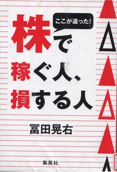 口座開設の用紙を証券会社に送り、あと何日かすると晴れて私も資本家になる予定です。優待券志望ですが、一応株の指南書でも読んで見るかという気で、この本を借りました。冨田晃右によりますと、株主優待や配当を当てにするのはアホだということになります。証券界でゴミのような一般投資家は、どうあがいても圧倒的な情報量をもつ機関投資家には勝てません。冨田晃右は我々のような小額の投資資金しか持っていないものは、はっきりと「負け組み」と言っています。どのような賭博も資金量が多いほうが勝つに決まっています。どの世界でも共通しているように、ここでも貧乏人は金持に食い物にされているのです。こうならないための唯一の手段は、トレーダーになることです。それも外部の情報をすべて遮断して、株価チャートだけを見て、下がったら買い、上がったら売るということに徹することだそうです。これができないからみんな損をしているのですが、それは冨田晃右に言わせれば、「新聞を読んだり、テレビを見たり、会社四季報を覗いたり、証券マンの言うことを鵜呑みしたり、投資顧問業者に頼りきっている」からだそうで、このような旬の過ぎた情報では勝てないに決まっています。ゴミみたいな個人投資家に回ってくる情報など、手垢のついた情報ばかりで新鮮なものは一つもありません。だったら日々刻々と変わるチャートを見て、その流れを感でつかむようにならないと、株では勝てないと言っています。腐った情報ではその感覚を駄目にしてしまいます。知らないほうがいいくらいです。