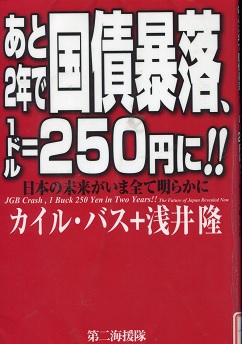 浅井隆の本は「国債暴落サバイバル読本」(2014年刊)を2014年の12月27日に読んでいます。この本は2013年刊です。内容も本の体裁もほぼ同じです。毎年浅井は同じようなことを言っているのでしょう。今年も同じような本を出しているのではないかと思われます。要は日本には1000兆円以上の大借金があり、この数年にクラッシュするので、日本円をドルに換え、そのお手伝いを浅井が主催する会社が執り行っているということを宣伝しているのです。今回はアメリカのファンドの社主カイル・バスを引っ張り出して、日本の破綻を強調しています。カイル・バスは日本円売りを行なっていて、ポンド売りで大成功を収めたソロスになろうとしている男です。今のところ損をしているようですが、日本の破綻を切に待ち焦がれている男です。日本の悲劇を心待ちにしている男などは速く破産して欲しいものです。今のところ1ドル104円台で浅井の言うところ250円になっていません。浅井はまたニュージーランドに移住を勧めています。もちろん円をニュージーランド・ドルに換えて預金も必要です。浅井の提言は我々貧乏人には関係ないことです。預金や株が一億円以上もあり、豪邸を持っている人が対象になります。我々はせいぜい日本がクラッシュになっても、生き延びるためには、今のうちから節制と節食に努め、病気体質になららいようにがんばるしかないようです。